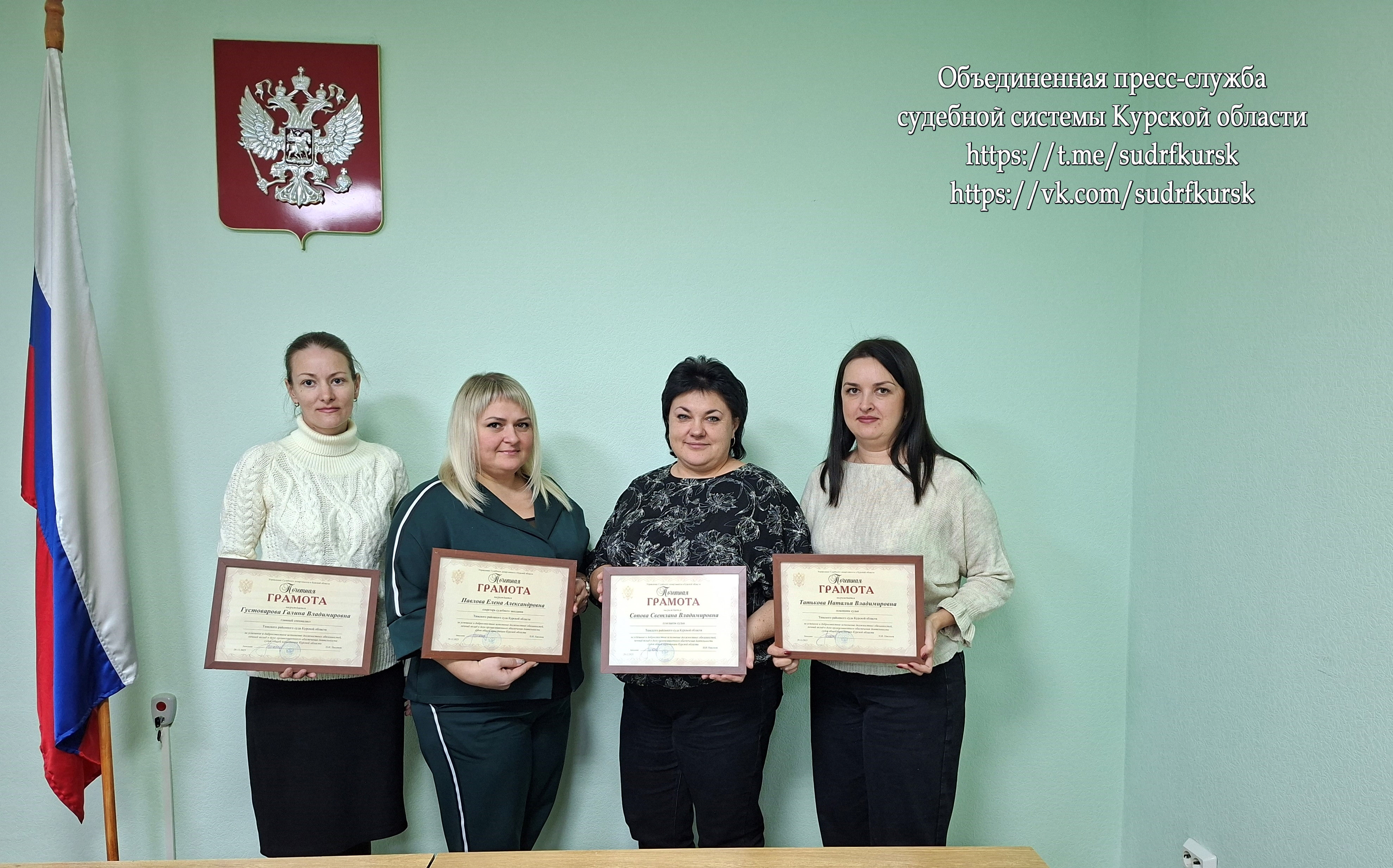 За успешное и добросовестное исполнение должностных обязанностей, личный вклад в дело организационного обеспечения деятельности судов общей юрисдикции Почетной грамотой Управления Судебного Департамента в Курской области награждены помощники судей Наталья Татькова и Светлана Сопова, главный специалист Галина Густоварова, секретарь судебного заседания Елена Павлова. Председатель суда Светлана Плотникова поздравила коллег с залуженными наградами и пожелала дальнейших успехов. Объединенная пресс-служба судебной системы Курской области При полном или частичном использовании материала ссылка на Объединенную пресс-службу судебной системы Курской области или официальный сайт Тимского районного суда обязательна. Для СМИ: дополнительную информацию можно получить по телефону +7 (47153)2-32-45, сотрудник Объединенной пресс-службы судебной системы Курской области Татькова Наталья Владимировна. Актуальные новости о судебной системе Курской области читайте в нашем канале в Telegram https://t.me/sudrfkursk и на официальной странице в социальной сети "ВКонтакте» https://vk.com/sudrfkursk (Объединенная пресс-служба судебной системы Курской области). |